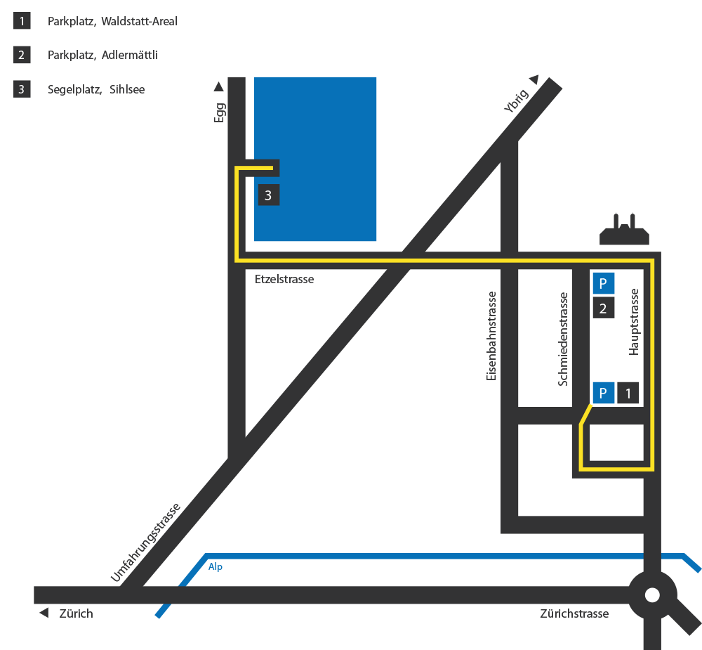 Umzugsroute: Schmiedenstrasse – Hauptstrasse – Parkplatz Adlermättli – PAUSE – Etzelstrasse (ohne Halt) – Hüendermattdamm, Segelplatz